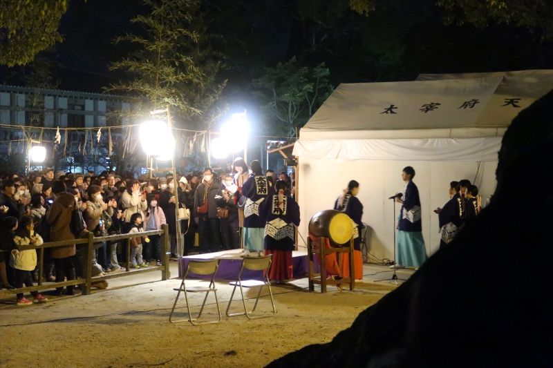 不過我們抵達太宰府時已經晚上六點多了,路上還開著的店不多。原本以為天滿宮接近關門時間會顯得冷清,沒想到當天剛好有活動。根據介紹是相關的驅鬼儀式,這是我第一次在晚上到達神社,也是第一次在神社看到明火。