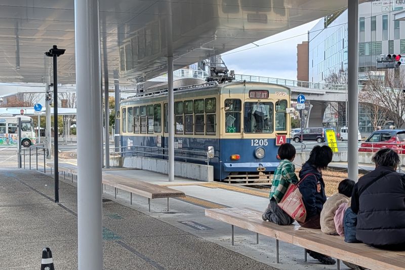 接下來我們要往飯店及熊本城方向移動。從車站出來,就會看到地面列車的月台。熊本市內的觀光依靠地面電車就可以完成許多了,因此我們選擇買24小時票。(原本以為地面電車在車站前會有售票處,我們到現場才跟著指示,線上用信用卡買票)