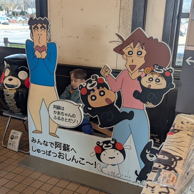 阿蘇真的是充滿觀光氣息的地方,車站內就附有詢問處及各式各樣可以索取的傳單。當然也有各式動漫聯名。