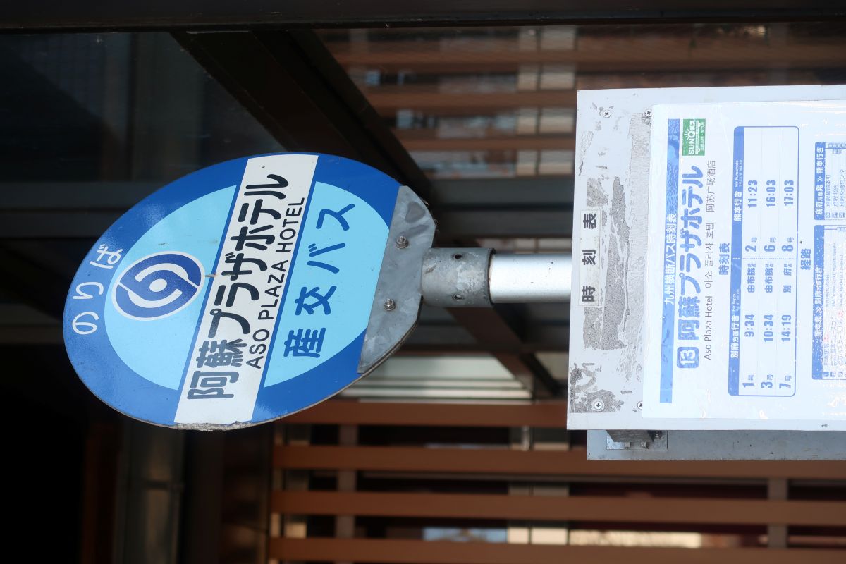 從阿蘇到黑川溫泉要搭乘巴士。而阿蘇廣場飯店不愧被我認定為日本當年的豪華飯店,連巴士站牌都設在飯店門口,以飯店為名。巴士還要特別轉進來飯店前面的上下客區。