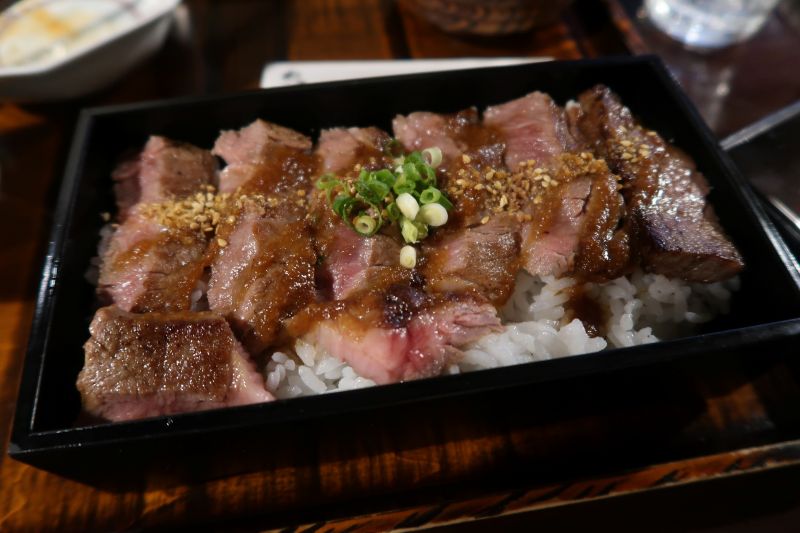 我們選擇了赤牛(あか牛)專賣店的わろく屋(Warokuya),而我覺得這是這一趟旅程我最推薦的餐廳。我跟B.C.點的特選あか牛重(2900円)有牛肉片蓋飯與小菜。也是和牛的赤牛的油酯香味配上醬汁,真的是極品。不配上一些飯,都覺得是暴殄天物。眾人所說的肉在嘴中化開,應該就是這種感覺。比起第三天吃的牛肉釜飯,這裡的規矩也沒有如此的多。