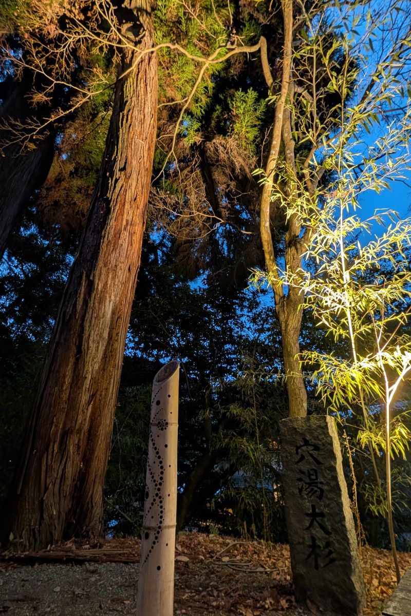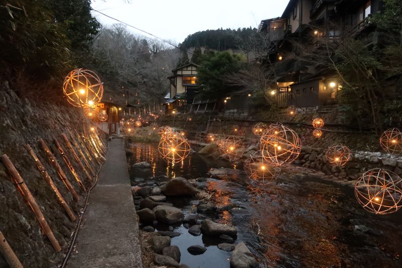 在冬天這段時間,黑川的溪流上會有竹子編成的燈飾。在黃色的燈光中很有在溫泉鄉的氣氛。