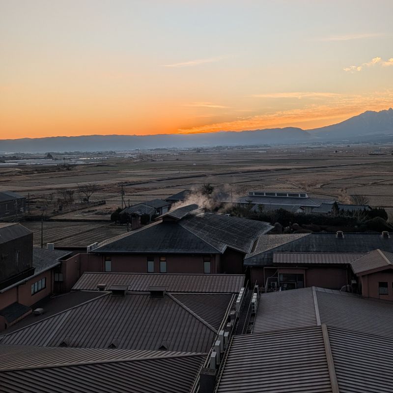 今天大家約七點起床。原本想要去泡飯店頂樓,可以遠望阿蘇山的露天溫泉,同時也可以欣賞日出。可是頂樓連更衣空間都在戶外,也沒有淋浴區。此時氣溫還在零度之下,我們實在是難以承受~不過既然都起床了,我就問了他們要不要再去泡一次湯,就再去一次別館二樓的大浴池啦。