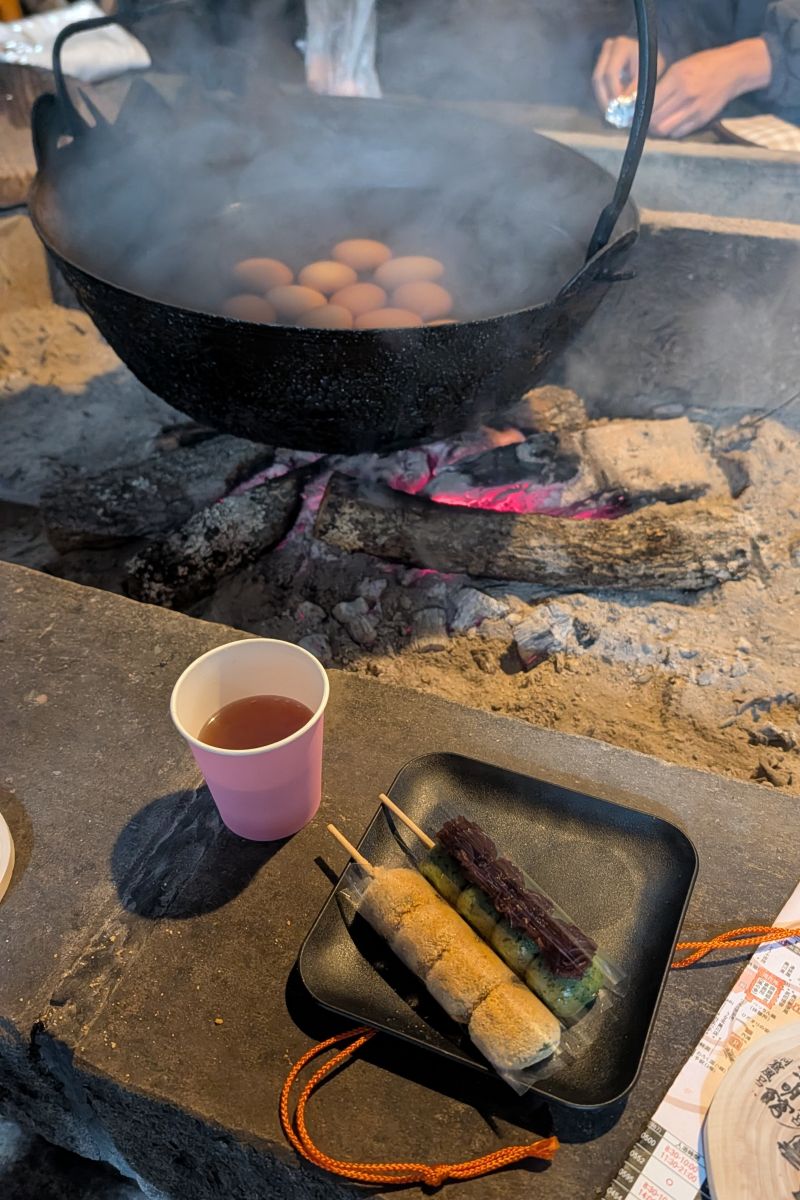 吃完午餐以後,我們共識是把手形的一次機會拿來吃伴手禮,畢竟已經泡了許多溫泉。我們選擇了這一家とうふ料理 吉祥。目前他們提供了三種甜品搭配選項,但導覽手冊上只有兩種,所以可能還是要實際拜訪一下店家。一進來庭院左手邊是正式店家,要兌換手形要到內側的小店舖。我選擇的是豆乳霜淇淋加一串糰子,而Willy與B.C.選擇兩個糰子與熱茶。雖然天氣冷,但是豆乳霜淇淋光聽起來就好吃啊~