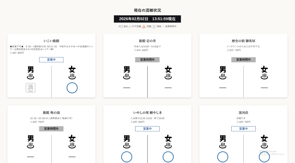 黑川溫泉的官方網站可以看到手形可前往的溫泉目前的使用狀況。