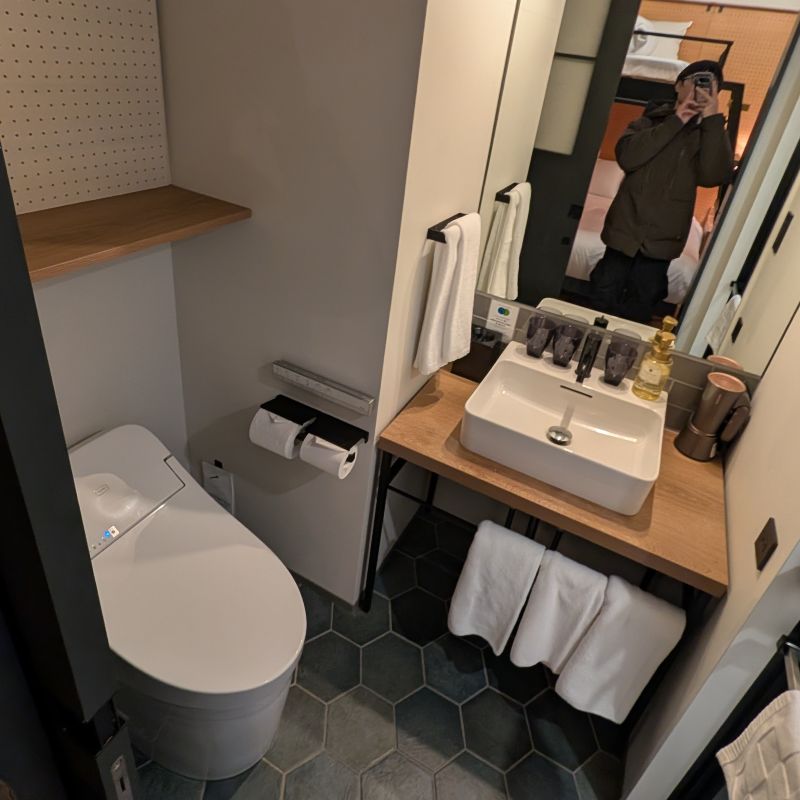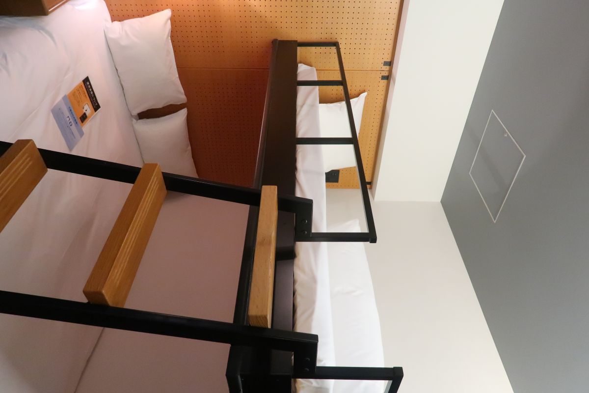 我們選擇了上下舖的床型。下面是一張雙人床,上面是單人鋪。雖然之前找評論時,有些人說房間空間滿大的。但是我們三個人實際住進來,打開三個託運的行李箱後,已經沒有什麼空間了。對要整理回國行李的我們,是有一點麻煩。
