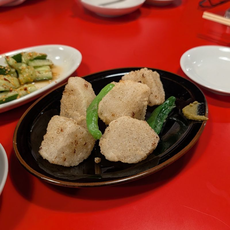弐ノ弐唸にのに (Ninoni),餃子一盤10顆算便宜,但是餃子不大。在這裡我意外還滿喜歡他們炸蘿蔔的調味。Willy點了杏仁豆腐。與臺灣不同的是,日本的杏仁豆腐會加入牛奶調味,所以會有比較濃的奶味,然後再用枸杞裝飾。我算是喜歡臺灣的杏仁豆腐,借吃了一口Willy的日本版,似乎也很符合我的胃口呢(吃起來確實跟臺灣的不太一樣)