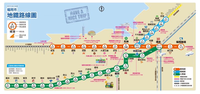 從大濠公園搭乘地鐵回博多時要留意,列車終點是不是福岡空港,要是搭乘到往貝塚的就回不了家啦。