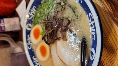 很多人推薦來福岡一定要吃ShinShin拉麵,據說是因為豚骨湯頭裡還帶有雞骨,所以吃起來比較清爽一點。正好我們手上有百貨公司的優惠券,所以我們就在百貨公司裡的分店享用了。