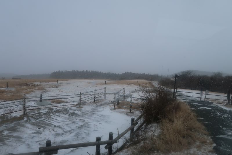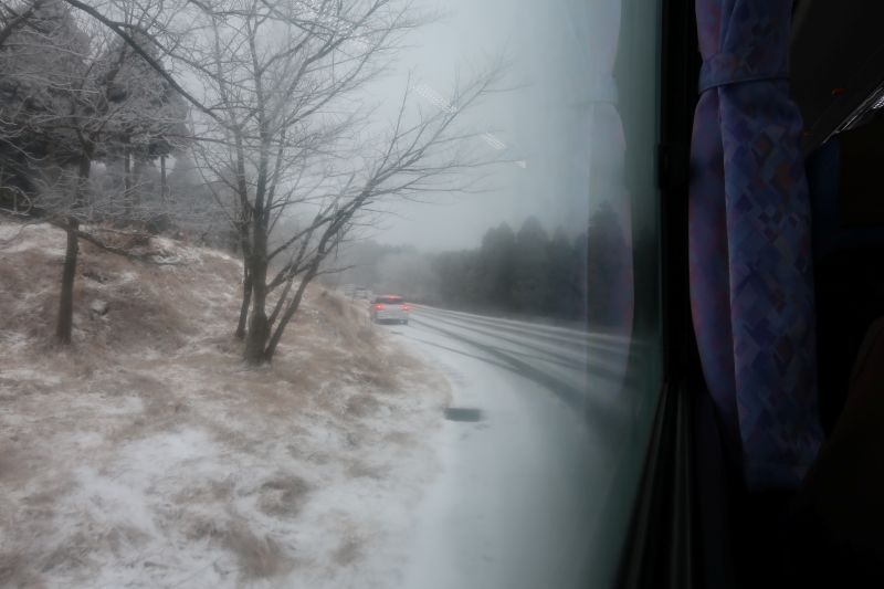 搭乘巴士駛離阿蘇站,沿著上山的公路,雪越積越厚。窗外也從一丁點雪,變成磅礡大雪。再向上一陣子後,雪已經鋪滿了道路。