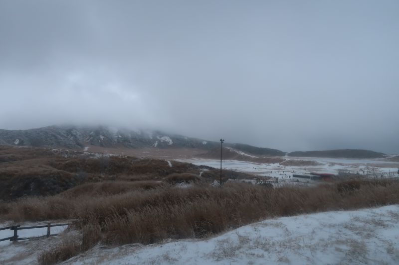 快要到阿蘇站時,看到遠方開始出現貌似被雪覆蓋的白色山頭。接著,路邊也漸漸出現少數的積雪。到阿蘇站一下車,天上的白雪也來迎接我們。