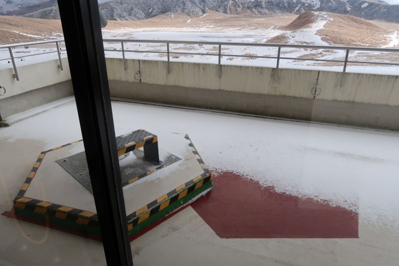 因為道路積雪,公路上的車輛都行駛的很慢速。原本半小時可以到達的路程愣是搭了快一小時。平時觀光客是在這裡轉「見學巴士」到火山口(不能使用一日券)。在熊本地震之前,是坐纜車到火山口的。還在ASO BOY上的時候,我們就在研究今天可不可以前往火山口,如果有毒氣體太多就不能上去了。有些資料寫說就算氣體多原定的火山口不開放,見學巴士還是可以繞其他的火山口(就不下車)。在火車上時,監測系統還是寫說火山口不開放,但我們還是抱著試一試的心態上山。結果,見學巴士因為大雪氣象不佳而停駛。還好山上總站同時也是伴手禮店,有些商品也只能在這裡買到,讓我們這一趟能在這裡停留一下。