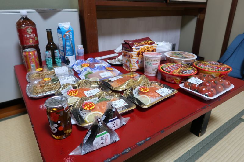 因為沒有訂飯店晚餐,附近也沒有餐廳,所以我們從飯店走十分鐘到附近的超市採購。雖然超市跟飯店在同一條路上,也有鋪設單側的人行道,但是路上幾乎沒有任何的照明,一旁只有休耕的稻田和一家藥妝店、一家柏青哥。要是只有一個人,我們大概只會在飯店旁邊的FamilyMart將就了吧。但是回程的時候,沒有光害的路上倒讓我們看到了幾乎佈滿的星空。
