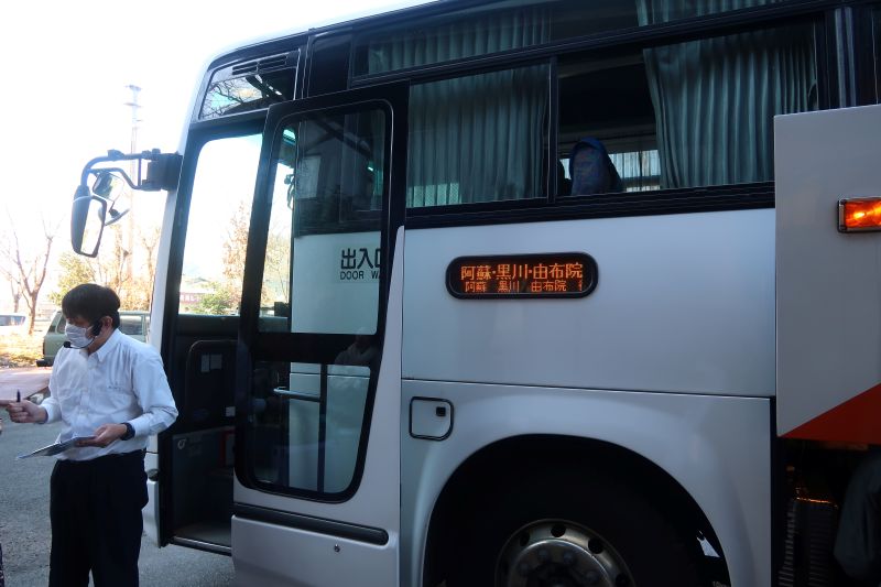 從阿蘇到黑川溫泉要搭乘巴士。而阿蘇廣場飯店不愧被我認定為日本當年的豪華飯店,連巴士站牌都設在飯店門口,以飯店為名。巴士還要特別轉進來飯店前面的上下客區。