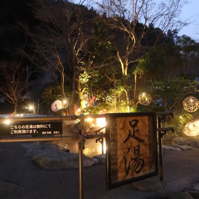 (這邊還不是本館) 我們回到了別館。別館門口有一個足湯,是任何人都可以使用的。夜景之下的足湯還別有氛圍。