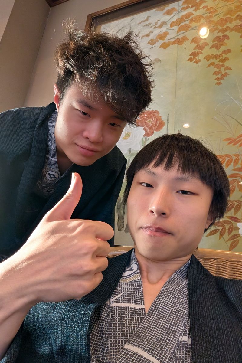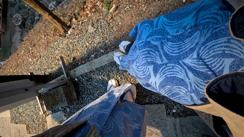 時間來到了可以辦理入住的時候。我們的房間在三樓,而別館只有樓梯,沒有電梯,所以我們花了點力氣把行李搬上三樓(還好行李還在)。房間的房門不高,B.C.會撞到頭。來溫泉區自然是要穿著浴衣拍照了,所以穿好浴衣後,我拉著他們又回到了黑川的街上。除了我們裡面仍然有穿內衣,飯店還提供了分趾襪與羽絨外襯,兩者皆能保溫,前者還能穿進拖鞋裡。