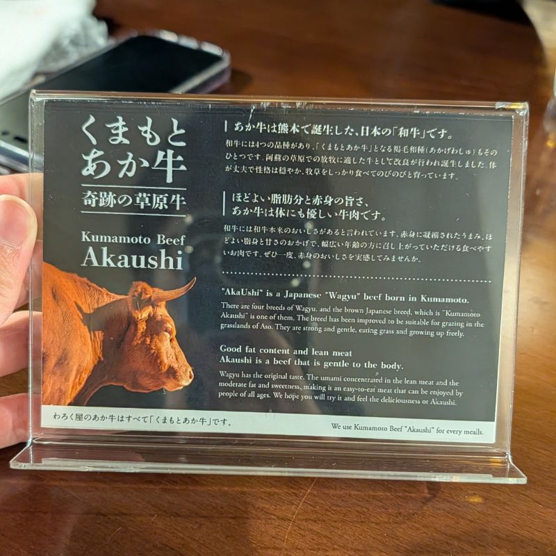 我們選擇了赤牛(あか牛)專賣店的わろく屋(Warokuya),而我覺得這是這一趟旅程我最推薦的餐廳。我跟B.C.點的特選あか牛重(2900円)有牛肉片蓋飯與小菜。也是和牛的赤牛的油酯香味配上醬汁,真的是極品。不配上一些飯,都覺得是暴殄天物。眾人所說的肉在嘴中化開,應該就是這種感覺。比起第三天吃的牛肉釜飯,這裡的規矩也沒有如此的多。