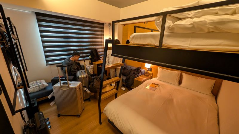 我們選擇了上下舖的床型。下面是一張雙人床,上面是單人鋪。雖然之前找評論時,有些人說房間空間滿大的。但是我們三個人實際住進來,打開三個託運的行李箱後,已經沒有什麼空間了。對要整理回國行李的我們,是有一點麻煩。