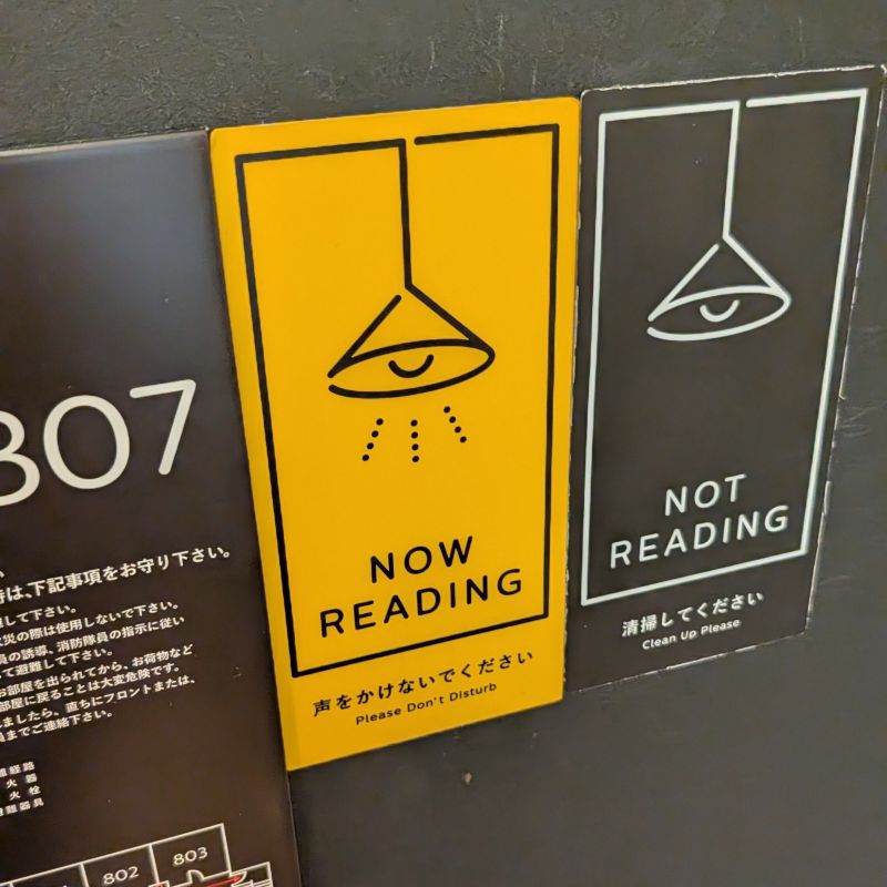 連請勿打擾與清掃指示牌,都是以讀書為主題出發。