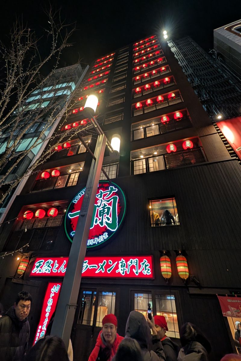臺灣人喜愛的一欄拉麵,總店位於天神過河另一端的中洲。每天晚上8點,一蘭總店外牆的露臺上會有日本風的舞蹈、音樂表演,搭配了笛子、小提琴等等。表演時長總共15分鐘。他們表演得很賣力,如果第一次來可以嘗鮮,不過對我來說到後面幾分鐘就有點疲乏了。幸好我們時間算得不錯,在排隊等待的時間,剛好看完了整場表演,就是抬頭看有一點累。